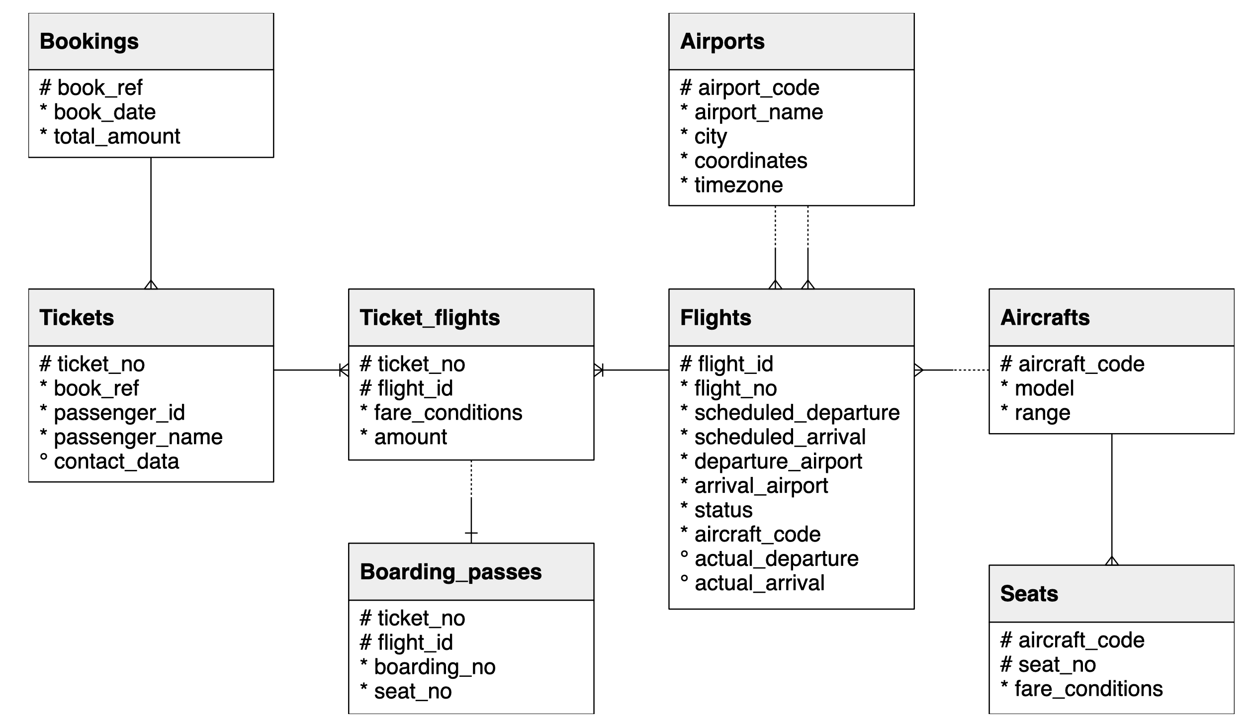 The demo is based on the PostgreSQL example DB “Airlines”. The legacy system is an old booking system. The main entity is a booking (bookings). A booking can include several passengers, where a separate ticket (tickets) is issued for each passenger. A ticket has a unique number and contains information about the passenger. As such, the passenger is not a separate entity. Both the name of the passenger and the number of his or her ID card may change over time, making it impossible to uniquely identify all tickets for a particular person; for the sake of simplicity, we can assume that all passengers are unique. The ticket includes one or more flight segments (ticket_flights). Several flight segments may be included in a single ticket if there are no non-stop flights between the point of departure and destination (connecting flights) or if it is a round-trip ticket. Although there is no restriction in the scheme, it is assumed that all tickets in the booking have the same flight segments. Each flight (flights) goes from one airport (airports) to another. Flights with the same flight number have the same origin and destination, but differ in the departure date. At flight check-in, the passenger is issued a boarding pass on which the seat number is indicated. The passenger can only check in for the flight if this flight is included in the ticket. The combination of passenger and seat must be unique to avoid issuing two boarding passes for the same seat. The number of seats (seats) in the aircraft and their distribution among different classes depends on the model of the aircraft (aircrafts) making the flight. It is assumed that each aircraft model has only one cabin configuration.