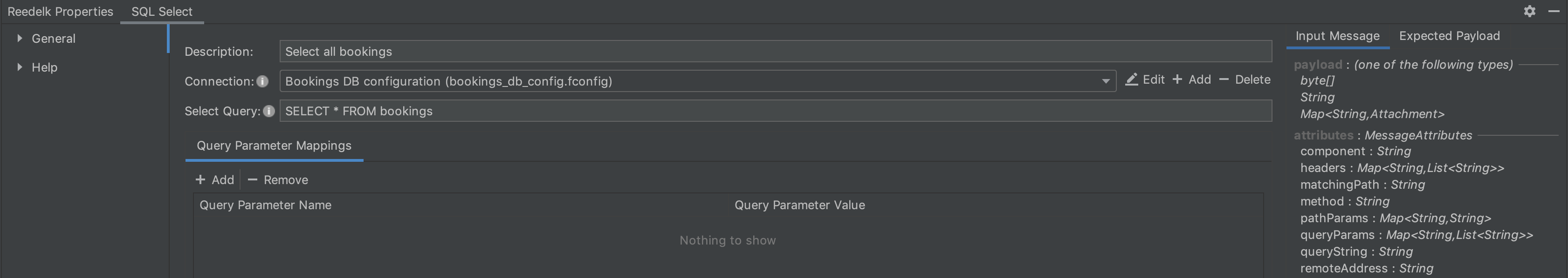 When the GET endpoint is queried, the database is relatively big. The table bookings contains over 2 million entries. The specification already contains the endpoint bookings/{booking_ref}, which can be used to query the booking for a specific booking reference. We can replace the existing mock with two components (SQL Select and Object-to-JSON), so this flow also returns a desired JSON as response. The select statement in the SQL Select component has to be configured according to the screenshot.