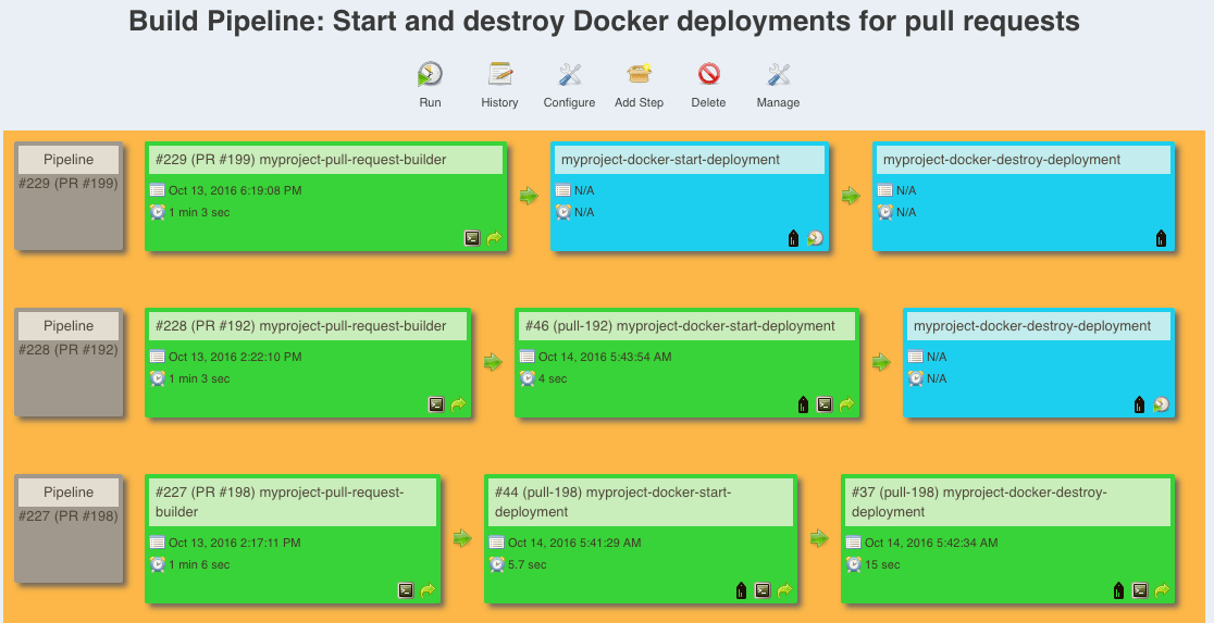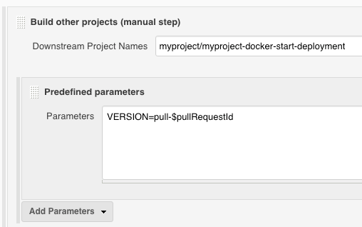 The job for building the pull request has a manual downstream job (part of the Build Pipeline Plugin ) which deploys app and database.