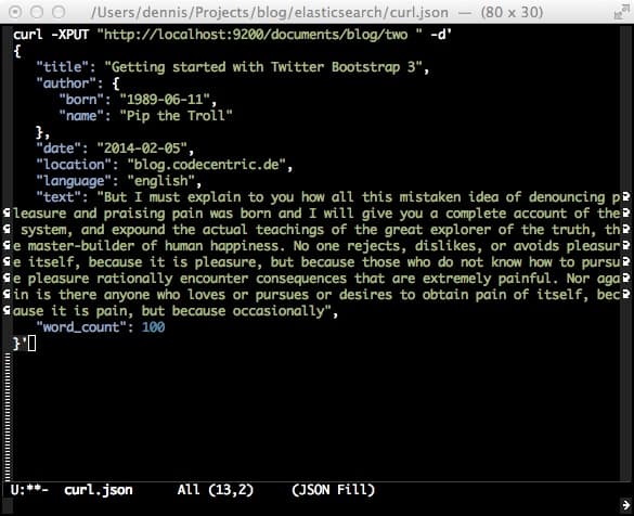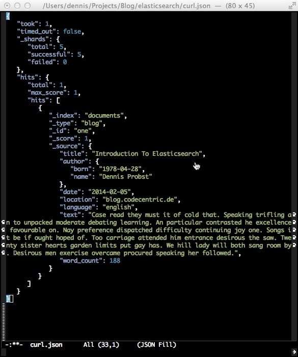 Let’s index something. We send off a HTTP PUT with the URL made up of the index name, type name and ID and in the HTTP payload we supply a JSON document with the fields and values. Notice the field author has another JSON object nested.