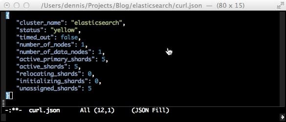 You can see that the cluster status is now yellow, because one of our two nodes is unassigned. The search functionality of the cluster is still working, though. If you set off our search requests from earlier again, but this time against port 9201 from NODE_2, you still get the search results, because everything we have indexed is available on every node.