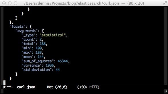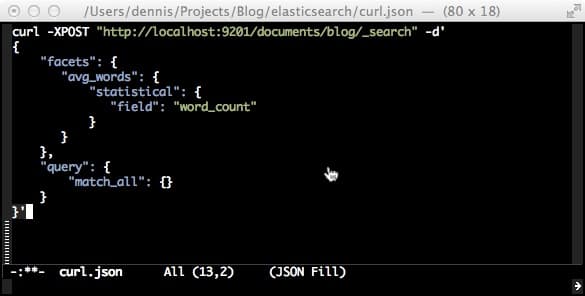 At some point you will be interested in information about the data you have indexed. In our case we might be interested in what is the average number of words over all indexed blog articles. Elasticsearch has a feature called facets that provides aggregated statistics about a query. This is a core part of Elasticsearch and is part of the search API. Facets are always bound to a query and provide aggregate statistics alongside the query results. Facets are highly configurable and can return complex groupings of nested filters, spans of amounts or spans of time, even full Elasticsearch queries can be nested inside a Facet. In Elasticsearch 1.0 this feature will be called Aggregations and is supposed to have more features and be more composable.