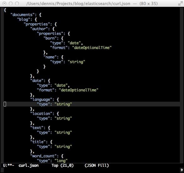 Here you get the mapping for the index documents. There is the type blog and a list of all properties from our blog. Elasticsearch automatically predicts the data types. If Elasticsearch doesn’t predict the right type for your field, then you can supply a mapping when you create an index.