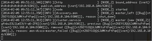 You can see that NODE_2 started. The node detected the other node as master and joined the cluster. The new node publishes to HTTP port 9201. You can talk to 9201 as well, as each node behaves the same. Any node starting up will join this cluster if, and only if it shares the cluster name. In our case as we haven’t defined a cluster name a default setting is in place.