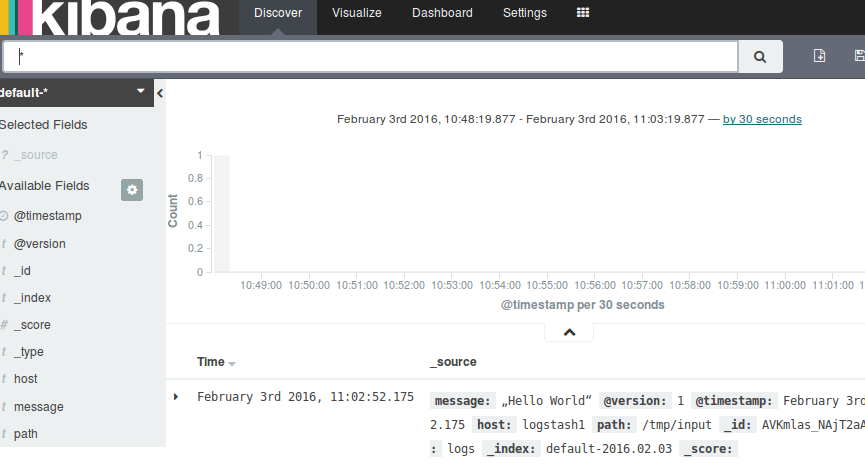 After a short time this message should appear in the Kibana index “default-*”: