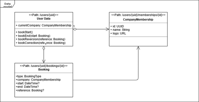 This model ties three entities together in a subtree of the firebase firestore. The user object itself stores user configuration (such as the current company context). It serves as the user preferences. The bookings collection aggregates all bookings. It allows reads and inserts, but blocks updates. The memberships collection permits user reads, but neither inserts nor modifications – otherwise the user would be able to add itself to any company. A privileged server component manages this collection instead.