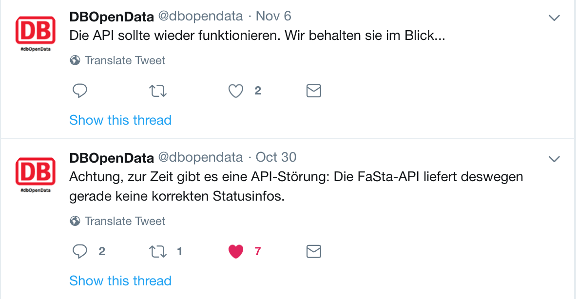 Roughly translated: The Tweet at the bottom notifies about an outage of the FaSta API. The Tweet above announces the issue has been resolved. So outages do happen and we also have some sort of indication about their duration (this was a major outage). We will use these dates later (30th Oct. to 6th Nov.) to check if we identified the outage correctly.