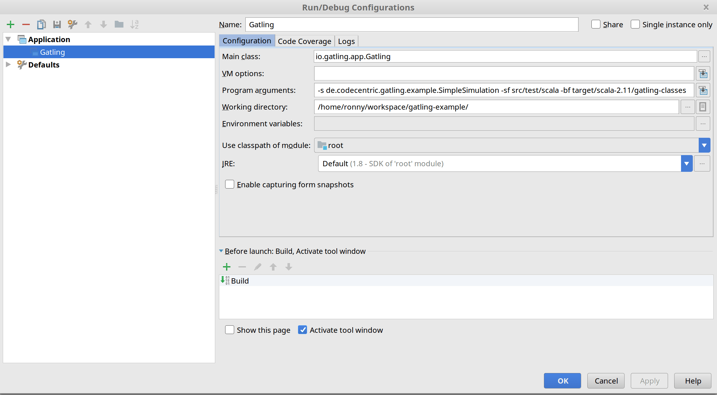 The -s option stands for “simulation”, -sf for “simulations folder”, i.e. the sources of the simulations and -bf for “binaries folder”. Those are actually Gatling’s command line parameters . In IntelliJ the configuration could look like this: