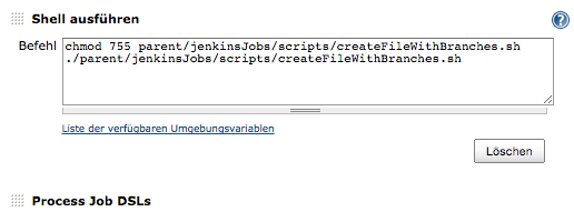 To create jobs for all branches, we need to know, which branches exist. We are using a small Shell-Script to create a new-line-separated text-file containing the branch names. It runs as an additional build-step in the seed-job. We are using Mercurial, and Mercurial is running on the same server. So we can just change to the mercurial-repo and ask mercurial.1WORKING_DIR=$PWD 2cd /opt/mercurial/hg-repo 3hg branches | column -t | awk '{printf "%s\n",$1}' | sort > ${WORKING_DIR}/branches.txt 4cd $WORKING_DIR