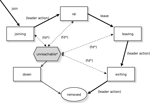 In a nutshell, nodes can join an existing cluster and existing member nodes can leave deliberately or by failure. The following picture from the Akka Cluster documentation shows all the possible states a member node can have: