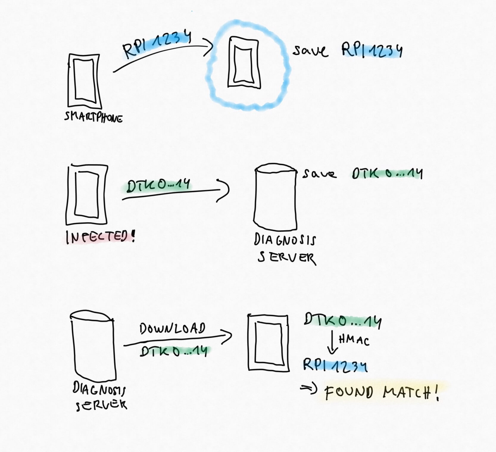 - On a regular basis, all clients fetch the IDs of all diagnosed cases from the so-called Diagnosis Server.