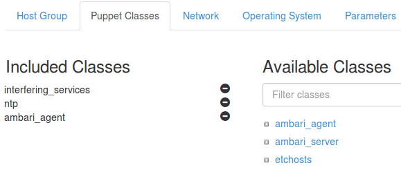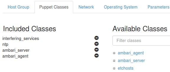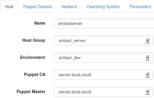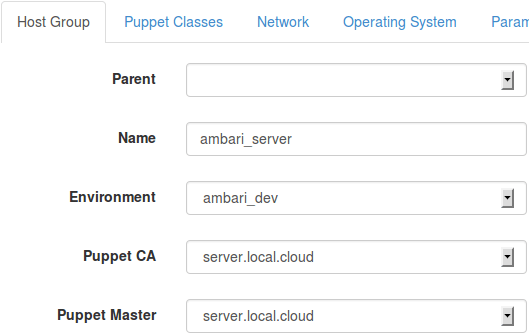 - Default Values: Go to Configure/Puppet classes, click the entry “ambari_server”, choose the tab “Smart Class Parameter” and click on the entry “ownhostname”. Now enter