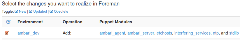 - Puppet Environment: Go to Configure/Environments and click on “Import from …” (your Puppet master should show up there). Now check the entry “ambari_dev” and click on “Update”. This imports the Puppet files that you downloaded in step one.