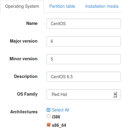/etc/puppet/puppet.conf) for Foreman to find the downloaded files.1[ambari_dev] 2 modulepath = /etc/puppet/environments/ambari_dev/modules 3 config_version = - Operating System: Go to Hosts/Operating systems, click on “New Operating system” and choose the configuration as shown below. This enables the provisioning of CentOS.