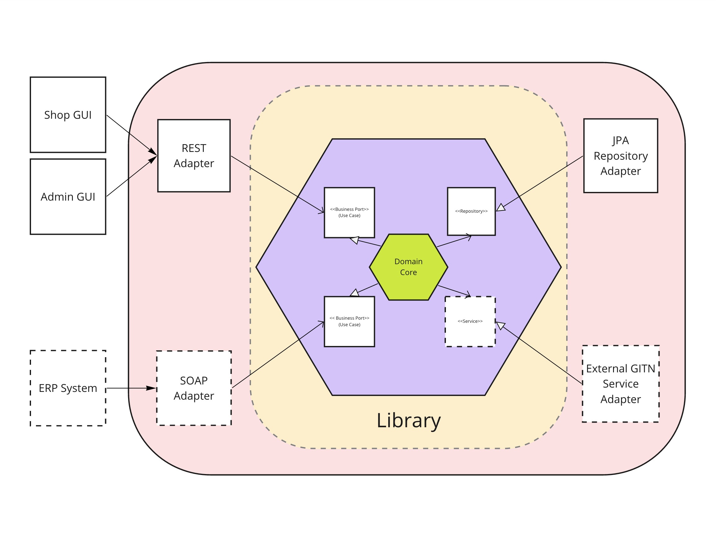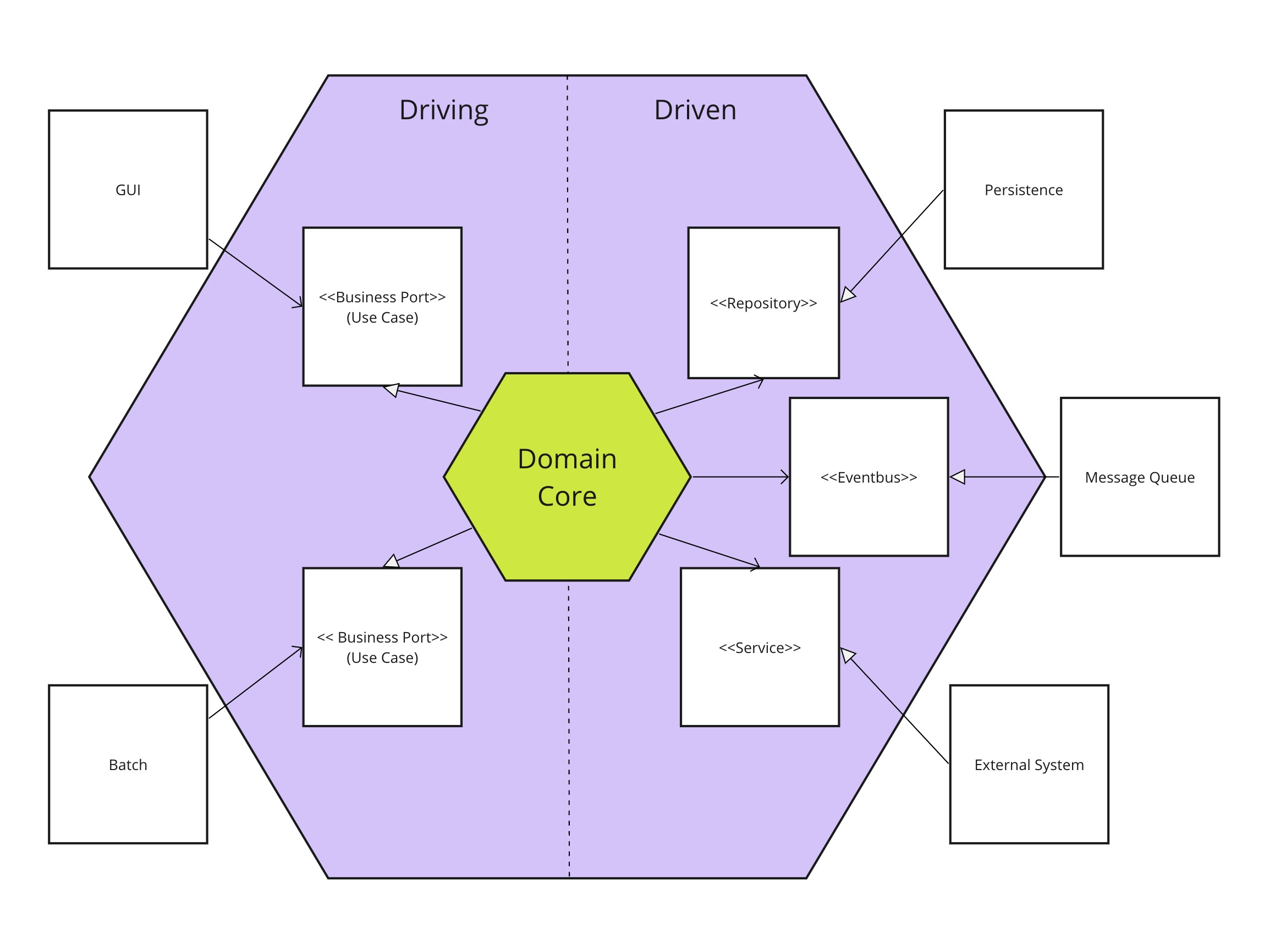 Note: The external adapters depend on protocols/interfaces provided by the core. On the left side, the interface is used by the driving adapters, on the right side, the interface is implemented by the driven adapters. All dependencies point inward, such that the core itself can remain entirely oblivious of its surroundings.