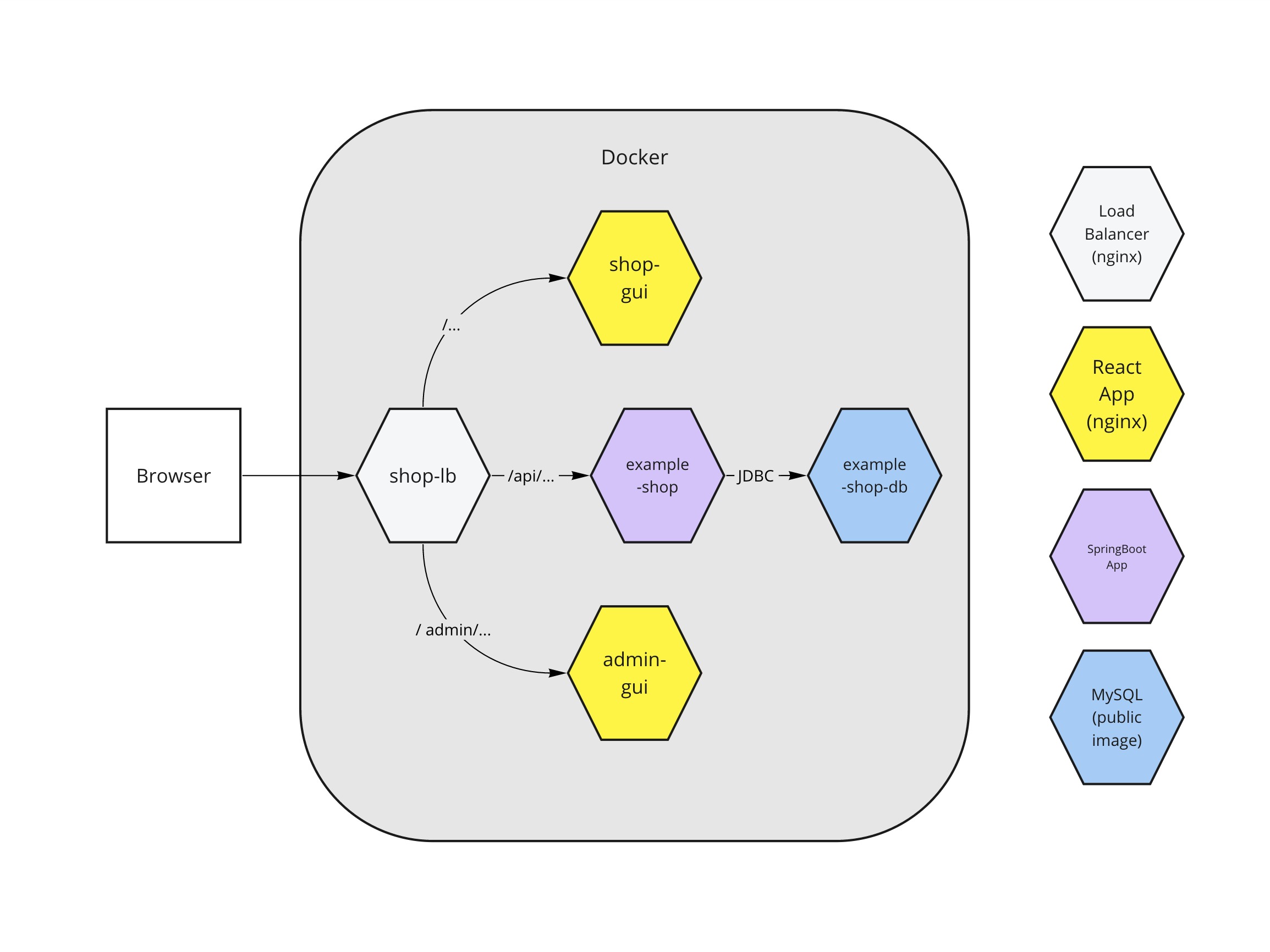 Our first implementation contains two frontend apps made with React (shop-gui and admin-gui), and a single server (example-shop), which uses SpringBoot for the backend, and a MySQL database. The domain core is included as a library (domain-core), which does not rely on any external dependencies, except for lombok (to allow for less source code) and joda-money (because we don’t want to implement currency handling ourselves).