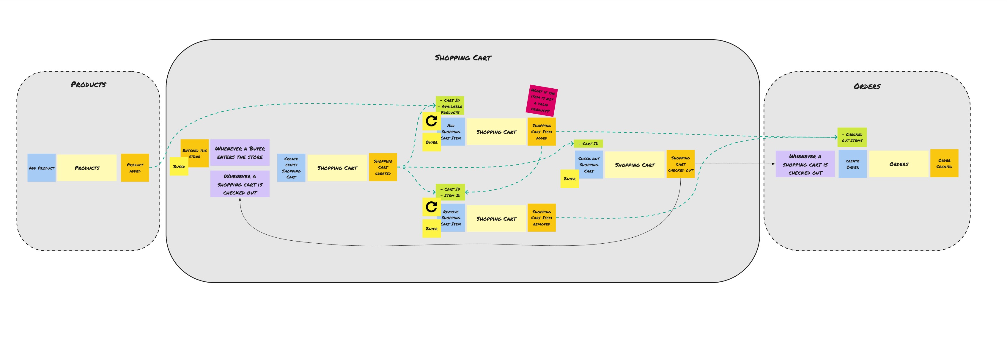 The domain really has only one bounded context deserving the title, “Shopping Cart”, along with two adjacent contexts, which merely use CRUD logic: “Products”, basically the source of master data, and “Orders”, the bucket in which we store our end product. There is only one transition across the context boundary, wherein a shopping cart is checked out and transformed into an order. There are three business rules (policies), all concerning the lifecycle of shopping carts and orders, and we’ve identified an issue where we want to make sure items are only added to a shopping cart, if they refer to a product that is actually in the catalog (in the past, we’ve had problems where people clicked on cached items in their browser, resulting in orders we couldn’t fulfill due to availability issues).
