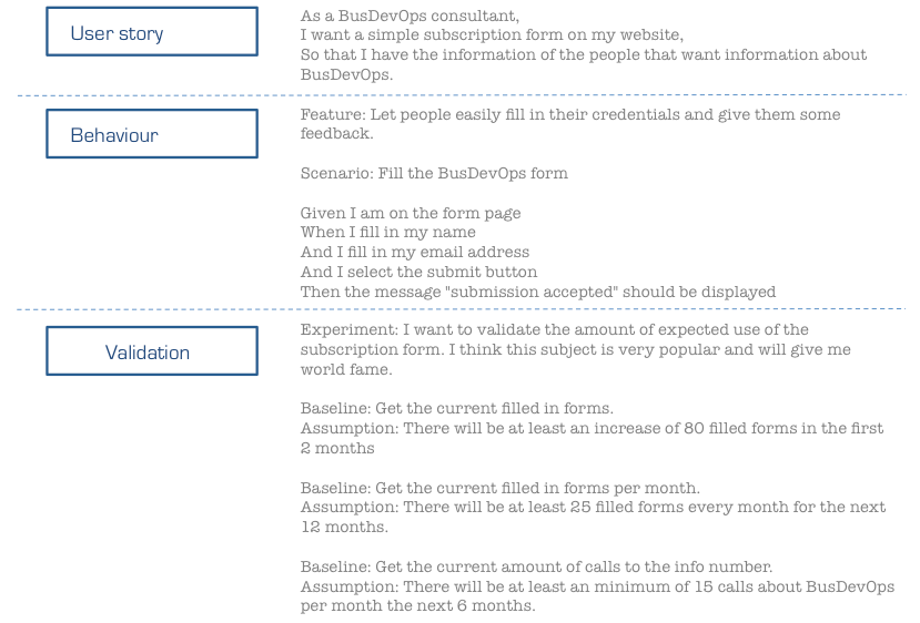We now want to introduce another dimension to make sure we achieve our goals. We add something we called an experiment, which includes some assumptions, to an user story. These assumptions can be measured and will be automatically validated.