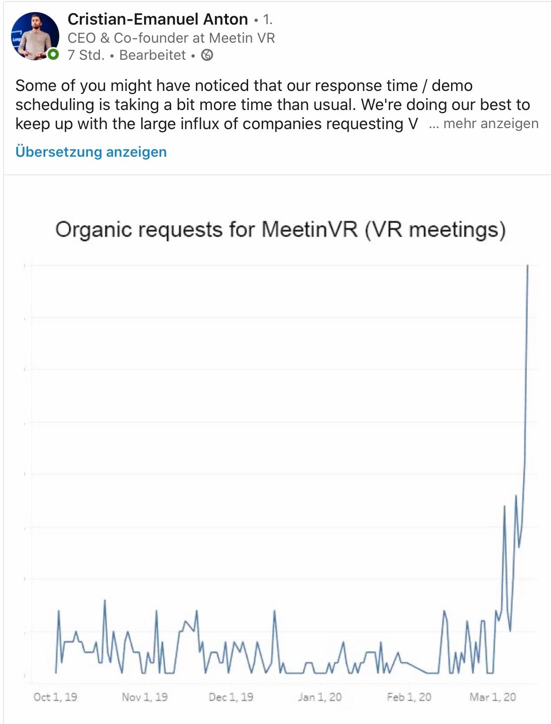 As you can see from the above message posted on LinkedIn, the “social distancing” strategy obviously drives many people to look out for alternative communication tools. At the same time, supply chains are breaking down, causing VR headsets to be sold out. Here’s what Oculus wrote to me in a mail when I requested Oculus Quest for Business headsets: