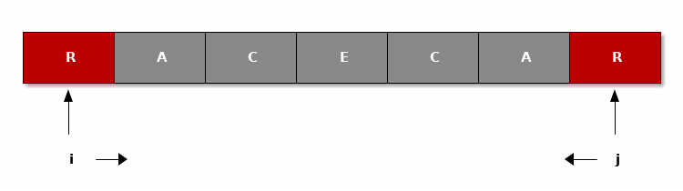 After a quick round on the white board, we come up with an alternative way to check for palindromicity: we keep track of two indices, starting from the very left and the very right of the palindrome. The idea is to then work our way towards the middle, comparing the characters as we go: