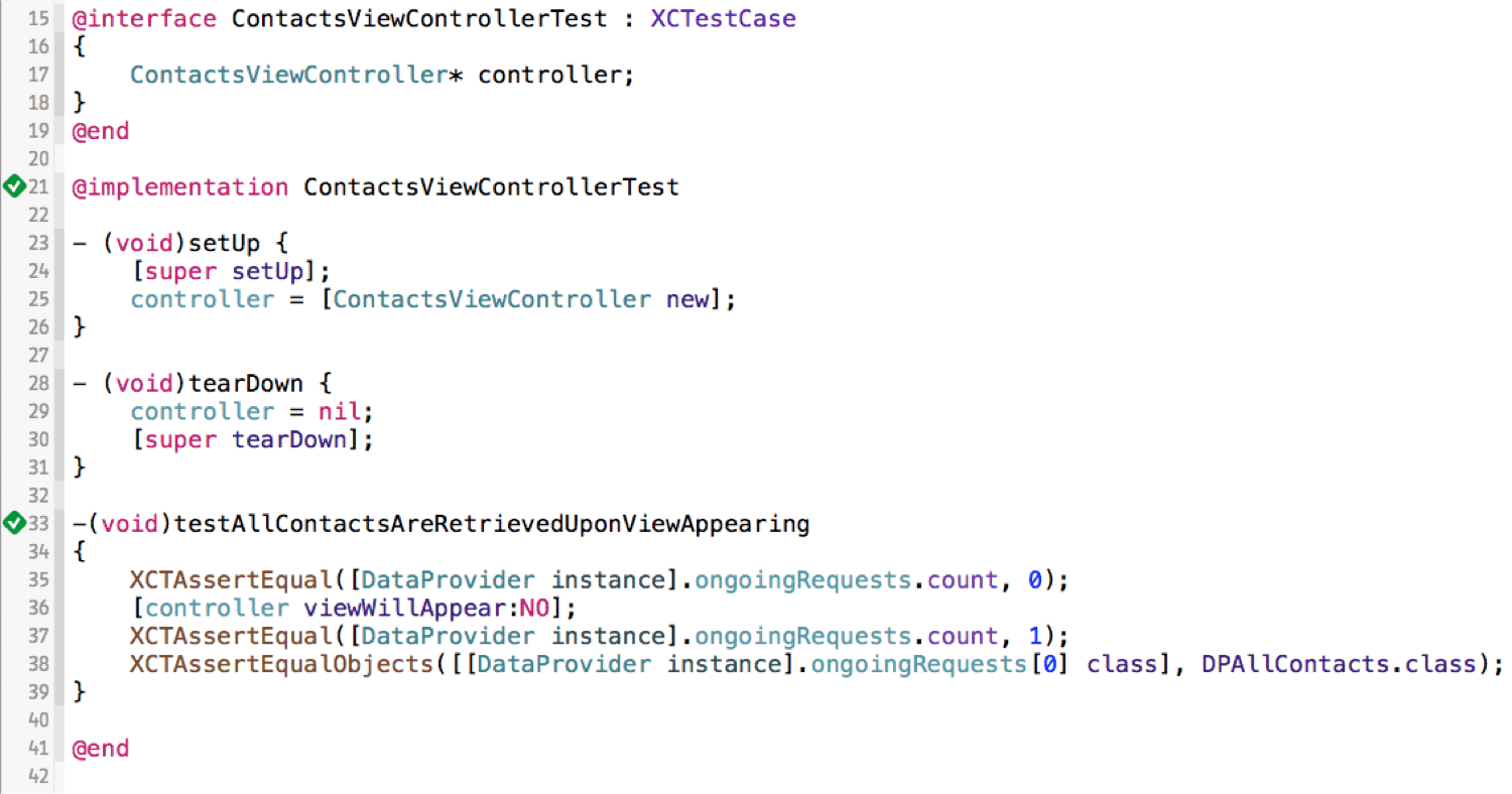 1@interface ContactsViewControllerTest : XCTestCase 2{ 3 ContactsViewController* viewController; 4 DataProviderMock* dataProvider; 5} 6@end 7 8@implementation ContactsViewControllerTest 9 10- (void) setUp 11{ 12 [super setUp]; 13 dataProvider = DataProviderMock.new; 14 SREG.dataProvider = dataProvider; 15 viewController = [ContactsViewController new]; 16} 17 18- (void) tearDown 19{ 20 viewController = nil; 21 dataProvider = nil; 22 [super tearDown]; 23} 24 25- (void) testAllContactsAreRetrievedUponViewAppeared 26{ 27 XCTAssertFalse(dataProvider.retrieveAllContactsCalled); 28 [viewController viewWillAppear:NO]; 29 XCTAssertTrue(dataProvider.retrieveAllContactsCalled); 30} 31 32@end