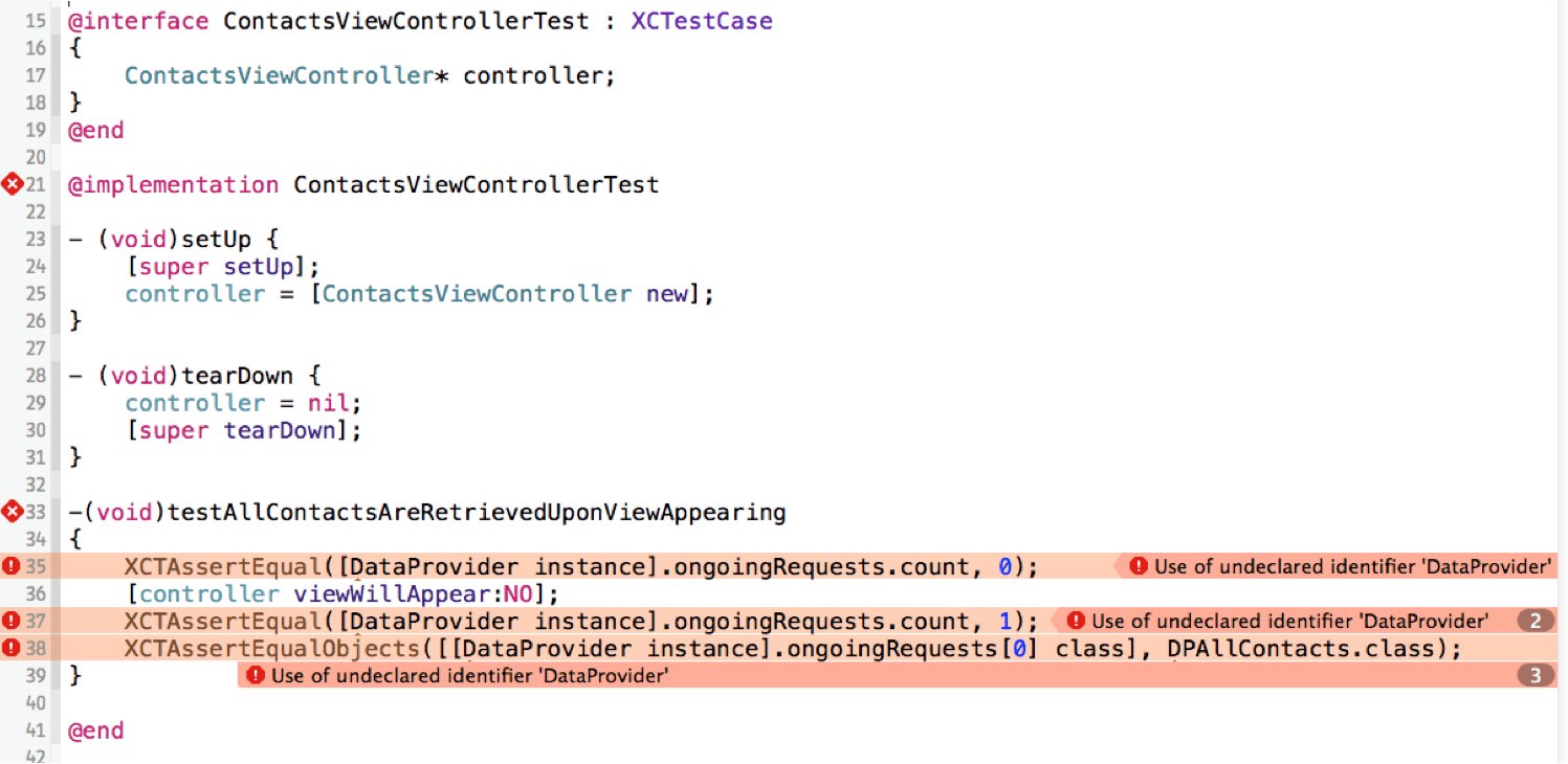 Now, our code can be compiled, but it doesn’t test anything yet. Let’s add our testAllContactsAreRetrievedUponViewAppearing method. This method will test that contacts from the server have been requested as soon as ContactsViewController has appeared.