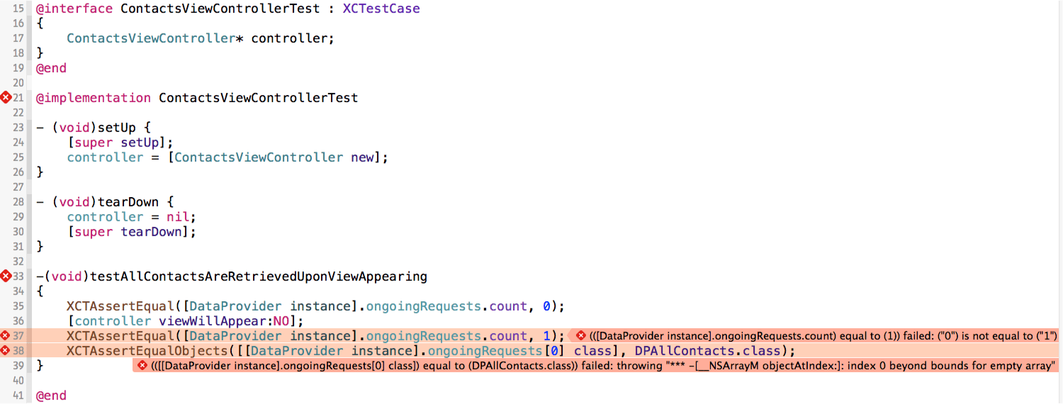 It has only one BOOL property (or properties should it be needed) so that we can check if retrieveAllContacts was called by ContactsViewController. Now, ContactsViewControllerTest looks like: