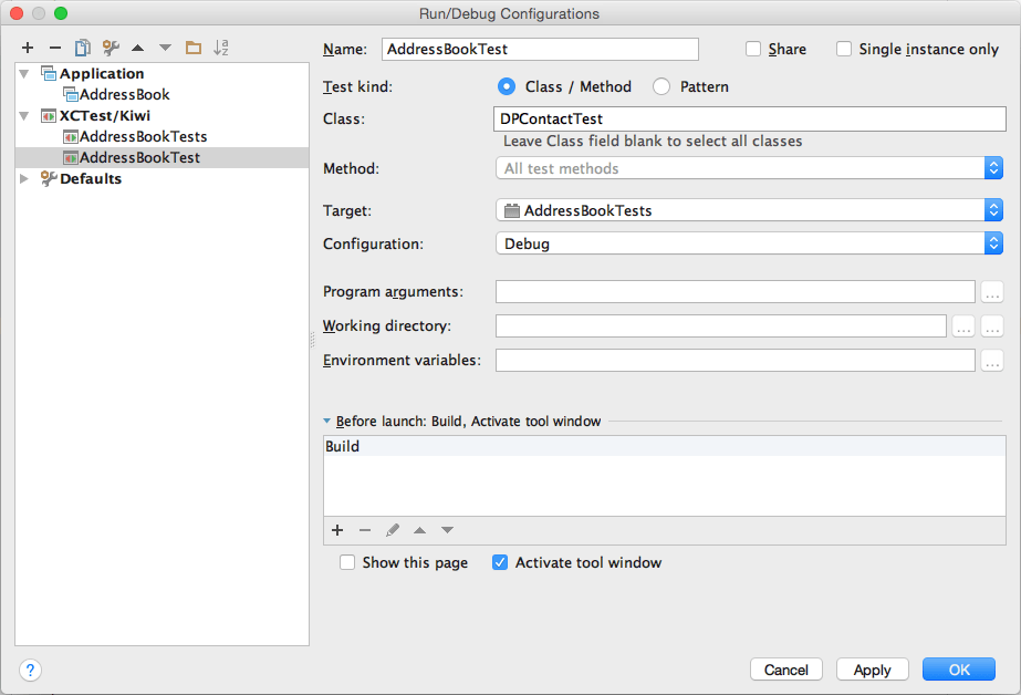 If you use AppCode for iOS development, there is one additional step that needs to be done. In AppCode, goto Run → Edit Configurations, click on the + button and select XCTest/Kiwi. It is useful to create two test configurations: