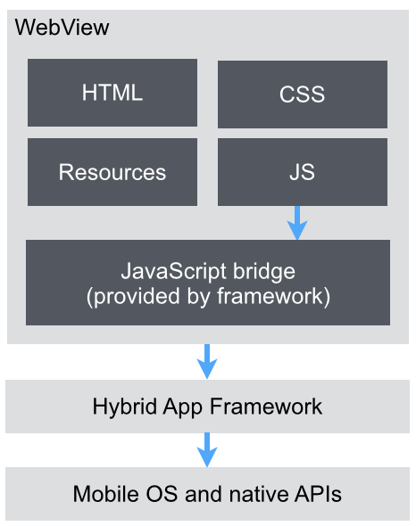 The previous image illustrates the high level architecture of Apache Cordova. Cordova is a platform for web-based hybrid apps. It does the heavy lifting of supporting and interacting with various device-specific APIs and combining the essence of all native APIs in one JavaScript API that is accessible by the hybrid app. Hybrid apps are running inside a WebView which is controlled by the Cordova framework. This is a complicated job considering the amount of platforms out in the wild.