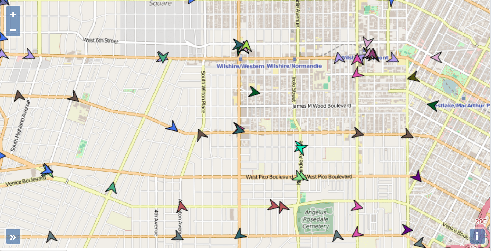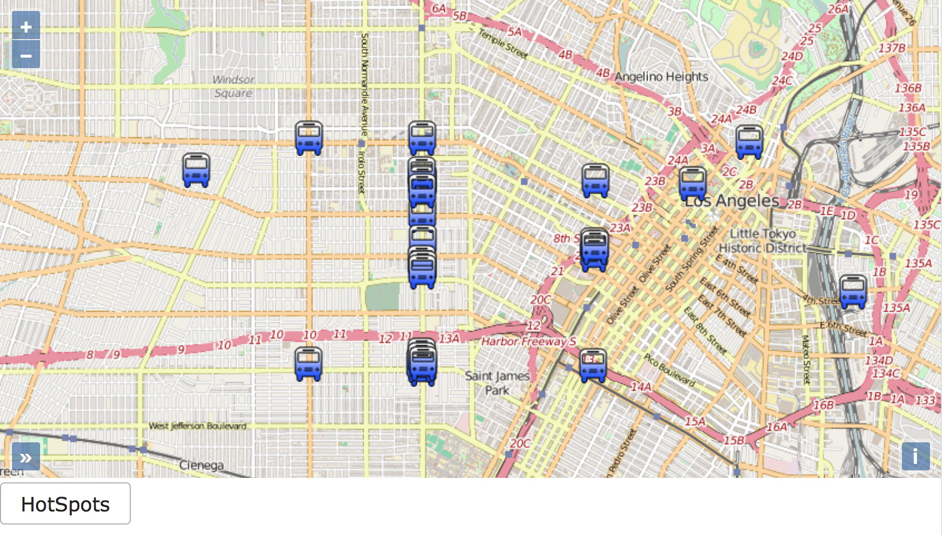 As can be seen in the video, the current vehicle positions are drawn on top of an OpenStreetMap in real time, previously collected data can be queried from Cassandra and also be drawn on the map. The collected vehicle data can be used for calculation of hotspots where a lot of vehicles meet.