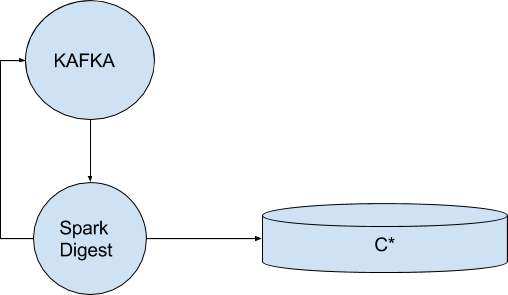 The Spark digesting application reads the incoming vehicle information from Kafka, enhances those for more efficient retrieval by the frontend, stores the enhanced data in Cassandra publishes it to Kafka as well.