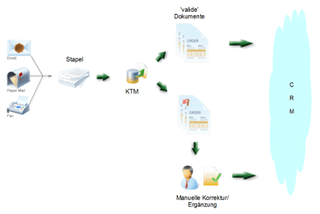 For item 1. we installed the Kofax product KTM (Kofax Transformation Modules). KTM can be seamlessly integrated into the capturing solution Kofax Capture. Now the meta data could be extracted automatically from the documents. To improve the data quality the meta data was checked against the database of the CRM system – if possible.