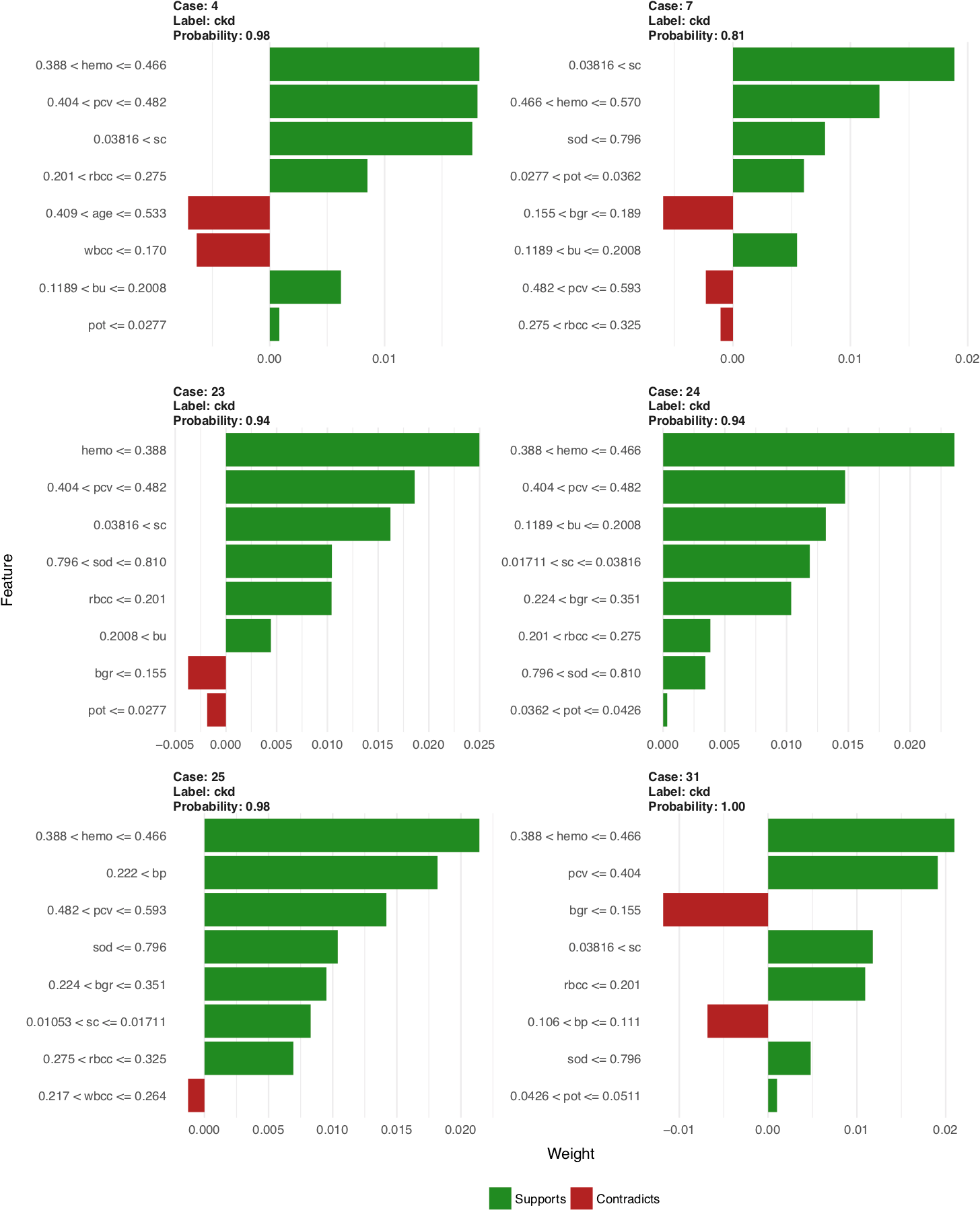 Each of the six facets shows the explanation for the prediction of an individual patient or instance. The header of each facet gives the case number (here the patient ID), which class label was predicted and with what probability. For example, the top left instance describes case number 4 which was classified as “ckd” with 98 % probability. Below the header we find a bar-plot for the top 8 most important features; the length of each bar shows the weight of the feature, positive weights support a prediction, negative weights contradict it. Again described for the top left instance: the bar-plot shows that the hemoglobin value was between 0.388 and 0.466, which supports the classification as “ckd”; packed cell volume (pcv), serum creatinine (sc), etc. similarly support the classification as “ckd” (for a full list of feature abbreviations, see http://archive.ics.uci.edu/ml/datasets/Chronic_Kidney_Disease ). This patient’s age and white blood cell count (wbcc), on the other hand, are more characteristic of a healthy person and therefore contradict the classification as “ckd”.
