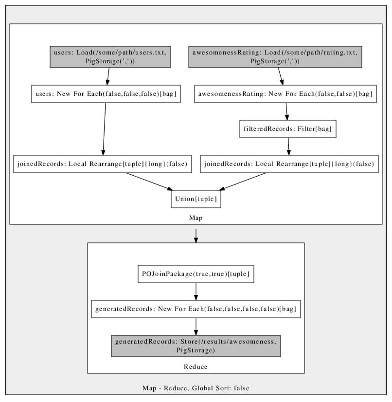 As you can see, from the code above, we have one file which contains all the users and the other one with their awesomeness rating. Since we are reading from TSV (Tab Separated Values) files, Pig requires appropriate schema defined which will be used for representation of the columns within.