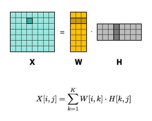 Depending on your taste, this might be a little bit too much of math. But let us give a interpretation of this in more layman terms: whenever we take a data matrix X of records and write it as product X=WH as in the following picture