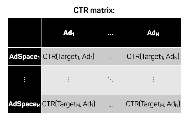 Assuming that we have M ad space in our complete network of publishers and N ads we could deliver, we can write down a matrix of shape (M x N) that records for each possible combination (Ad, AdSpace) the currently observed click-through rate. This matrix is called click-through matrix (for short: CTR matrix).
