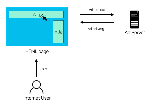 Typically, we would have many of these possible ads. The decision which ad should be placed in which ad container is handled by an ad server that handles the request for ad material sent by the web page. This is depicted in the following illustration: