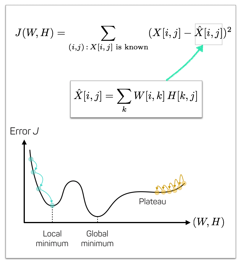 We attempt to approximate X as WH (denoted as X with a hat in the picture). For this, we try to minimize the error J(W,H). This error is given by comparing the squared errors between the known entries of X and the approximation WH. (Remember our click-through matrix has missing values; so this fits into the overall picture.) One can use the Alternating squares algorithm (ALS) to compute such an approximation.