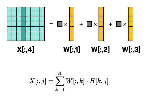 This says that the j-th column of the product X is given by weighting the columns of W with the corresponding weights from the j-th row of H and summing everything up.