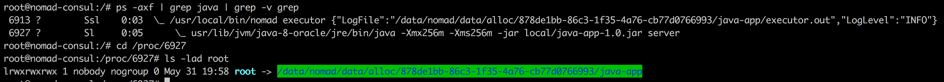 To get a better overview how a Nomad job is created and where the job stores the necessary files, we will analyze the running Java job. First, we need to get the pid of the running Java process