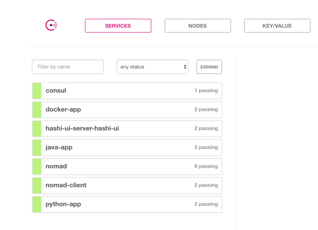 Navigating to the Consul-UI (link when the VM is started), we can see that all jobs are registered in Consul as services. In the job specification under the service block we define the necessary values for the Consul registration. With the services registered in Consul we get features from Consul like: service registration, failure detection and configuration sharing.