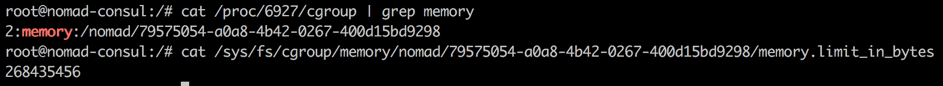 As expected, the cgroup memory limit in bytes corresponds to the value defined in the jobs specification in megabytes. With these two basic Linux features, cgroups and chroot, Nomad creates isolated environments (allocations), which allows us to separate memory and CPU for a process and jail a process to its own set of binaries. This gives us the ability to have resource isolation for plain java or python apps.