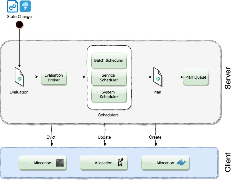 When we submit a job specification to the Nomad server, we initiate a desired state. The job specification defines that we want to run a task. A task creates an individual unit of work, such as a Docker container, web application, or batch processing. This unit of work is deployed a certain number of times and under specific constraints, as we have mentioned in the first example above where we want to deploy 3 new instances of service ‘D’ with the requirements of 1 GB RAM and at least 500 MHz CPU. The jobs define the desired state and the Nomad server analyzes the actual state and triggers the evaluation process. In the picture below the evaluation and scheduling process is displayed.