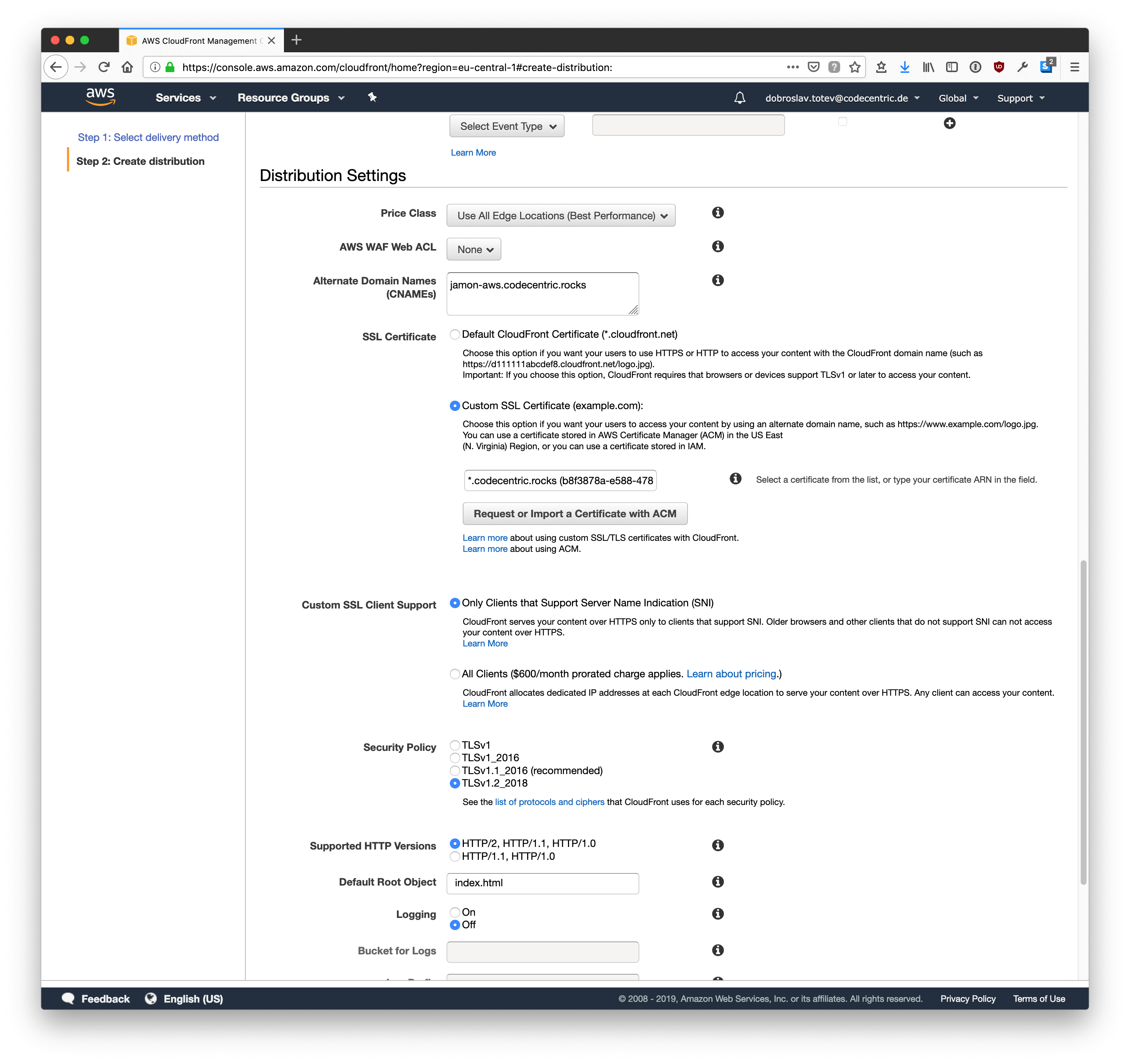 For the distribution settings, fill out the desired CNAME and select the previously added certificate. Don’t forget to select a recent security policy.