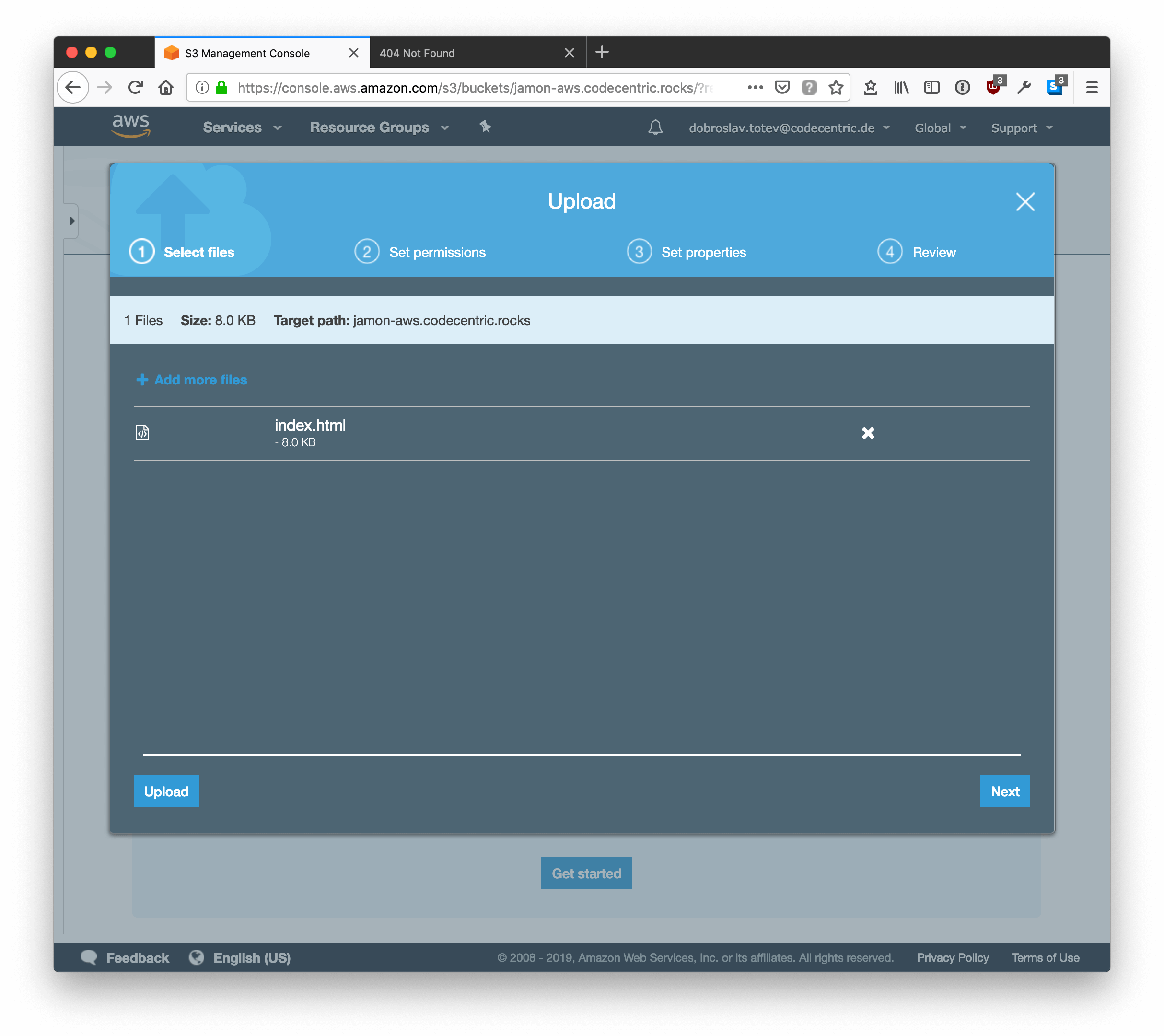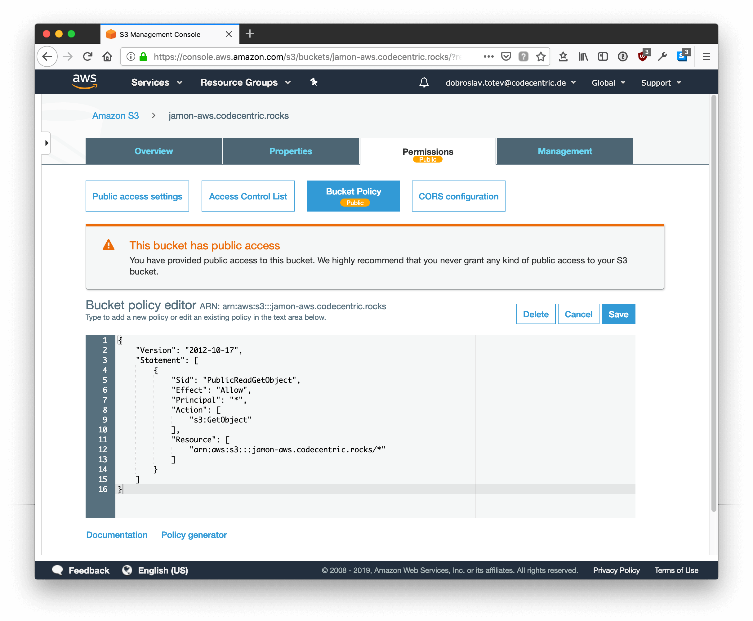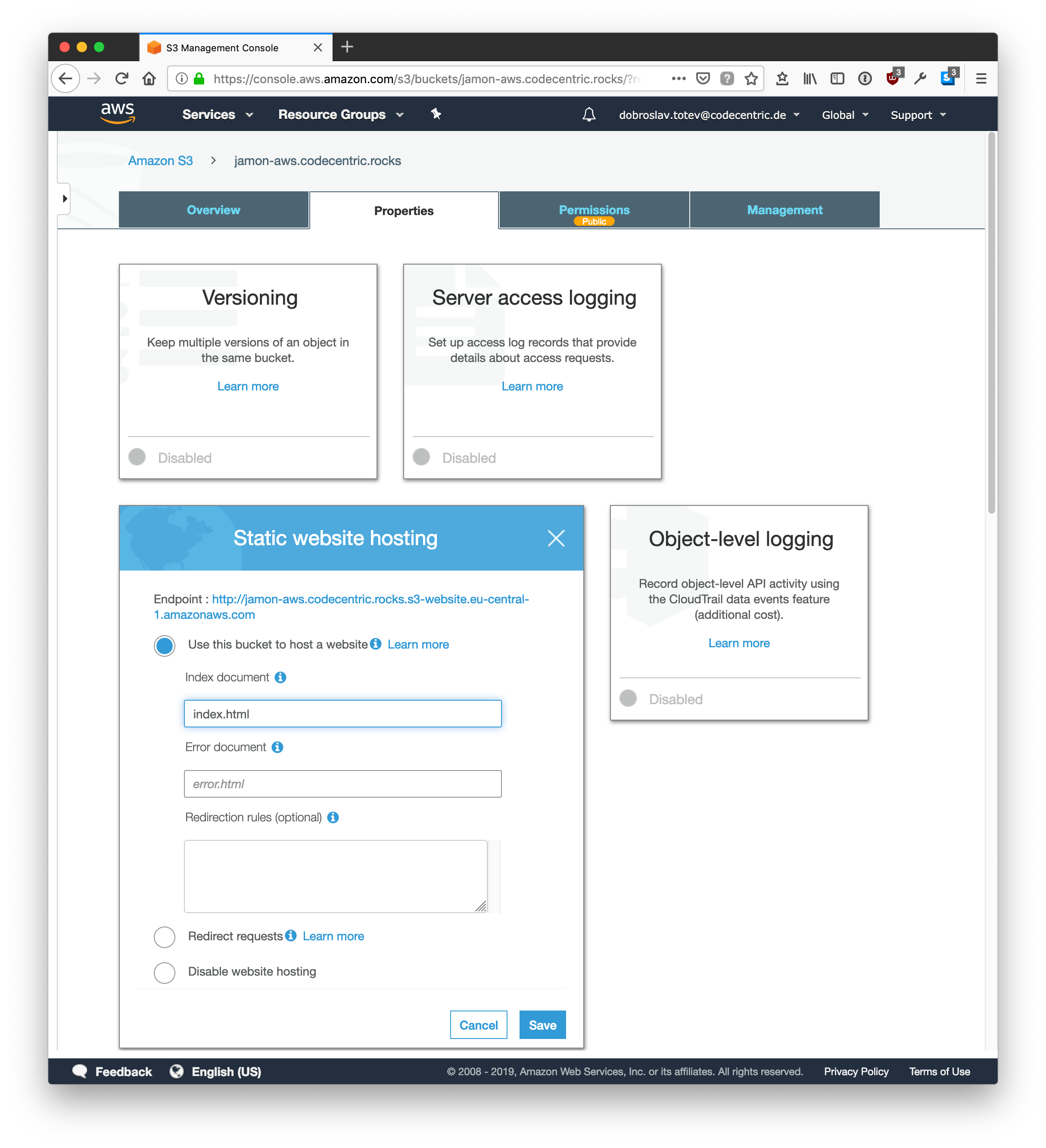 Now the content of the S3 bucket is live and can be accessed underhttp://YOUR-S3-BUCKETNAME.s3-website.AWS-REGION.amazonaws.com/ (in this case it’s http://jamon-aws.codecentric.rocks.s3-website.eu-central-1.amazonaws.com/)
