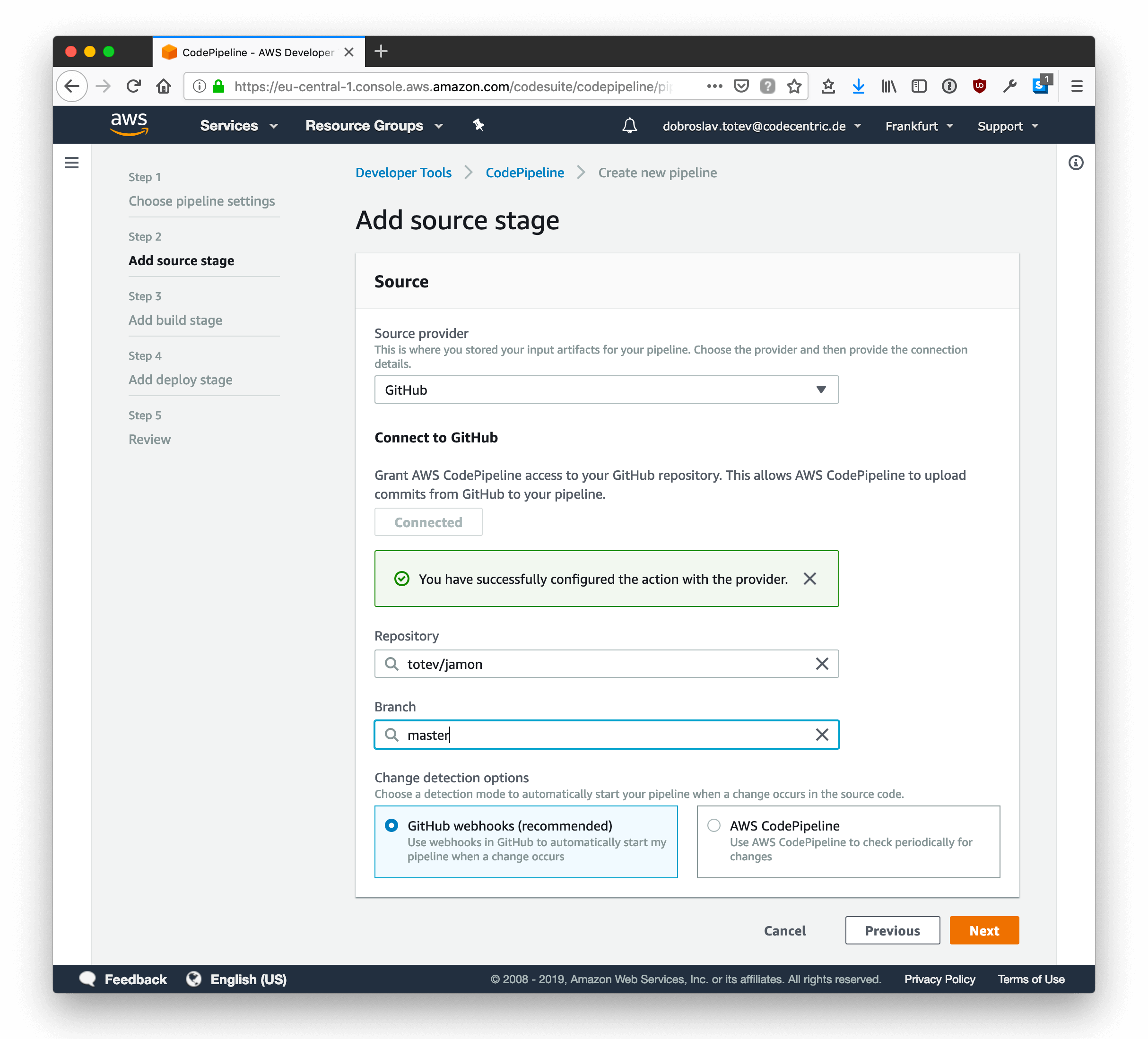 Setting up CodePipeline for this project is easy, because no actual building is required. The “code” is being checked out of the GitHub repository and pushed into the previously configured S3 bucket ultimately replacing its contents.