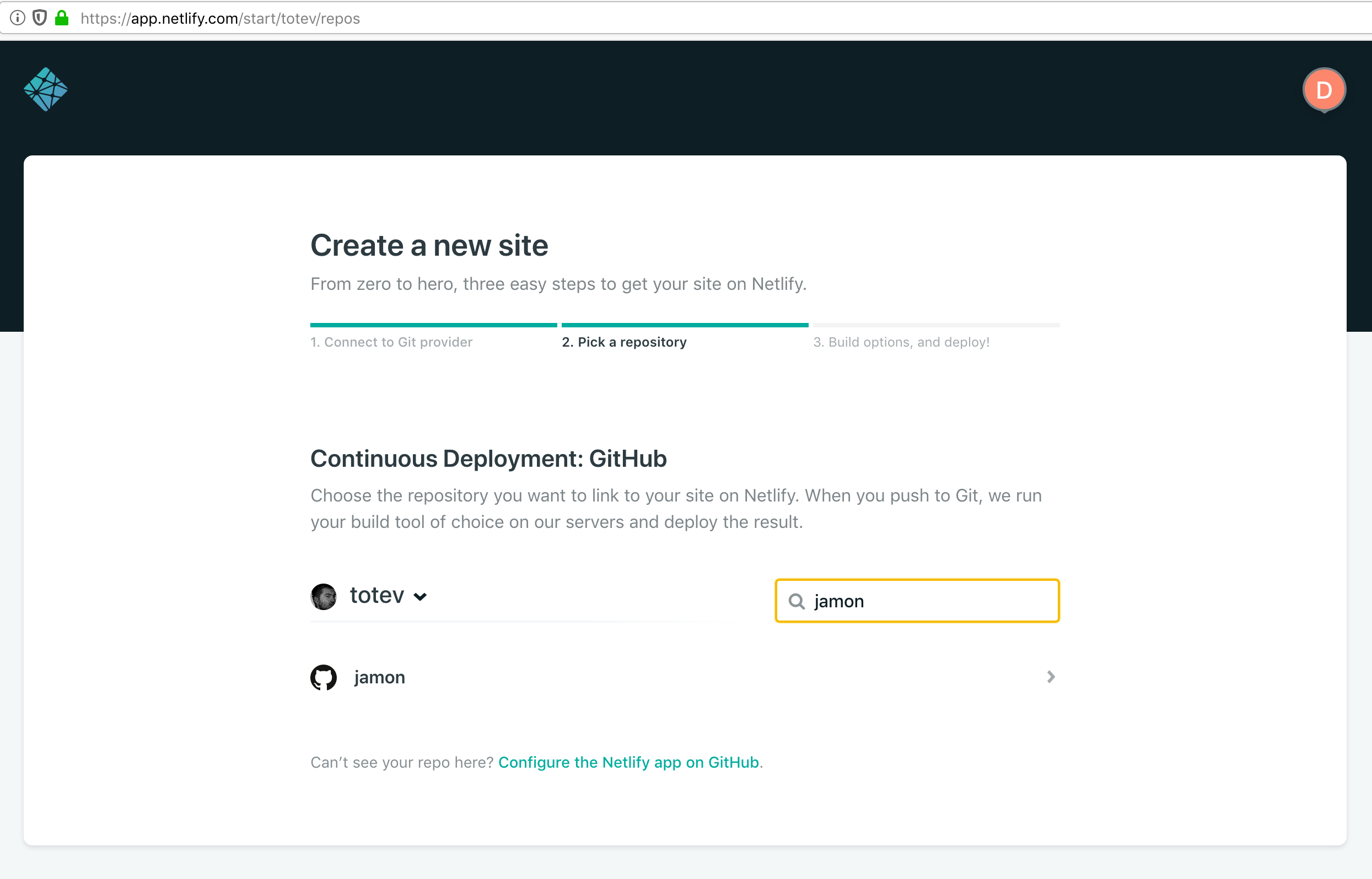 Because of the fact that my project is hosted on GitHub, I just go to “Create new site” and select GitHub as the desired provider and grant Netlify access to the correct repository.