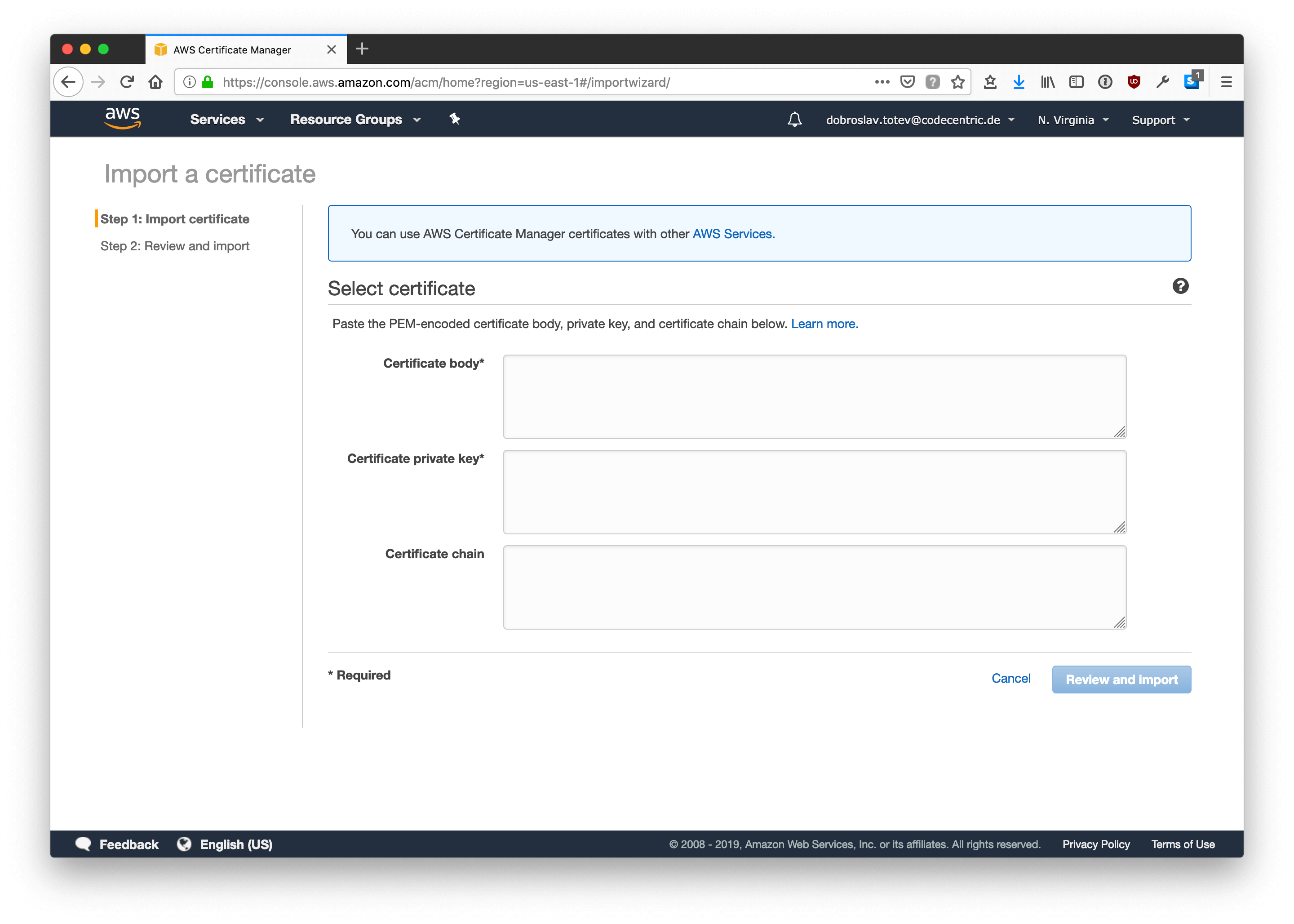 For providing TLS, CDN support, as well as allowing custom domain support, I’m going to be using AWS’ content delivery network – CloudFront. Prior to setting up CloudFront, we must import our SSL certificate into the AWS Certificate Manager in the *us-east-1* region (yes, even if everything else is in a different region).