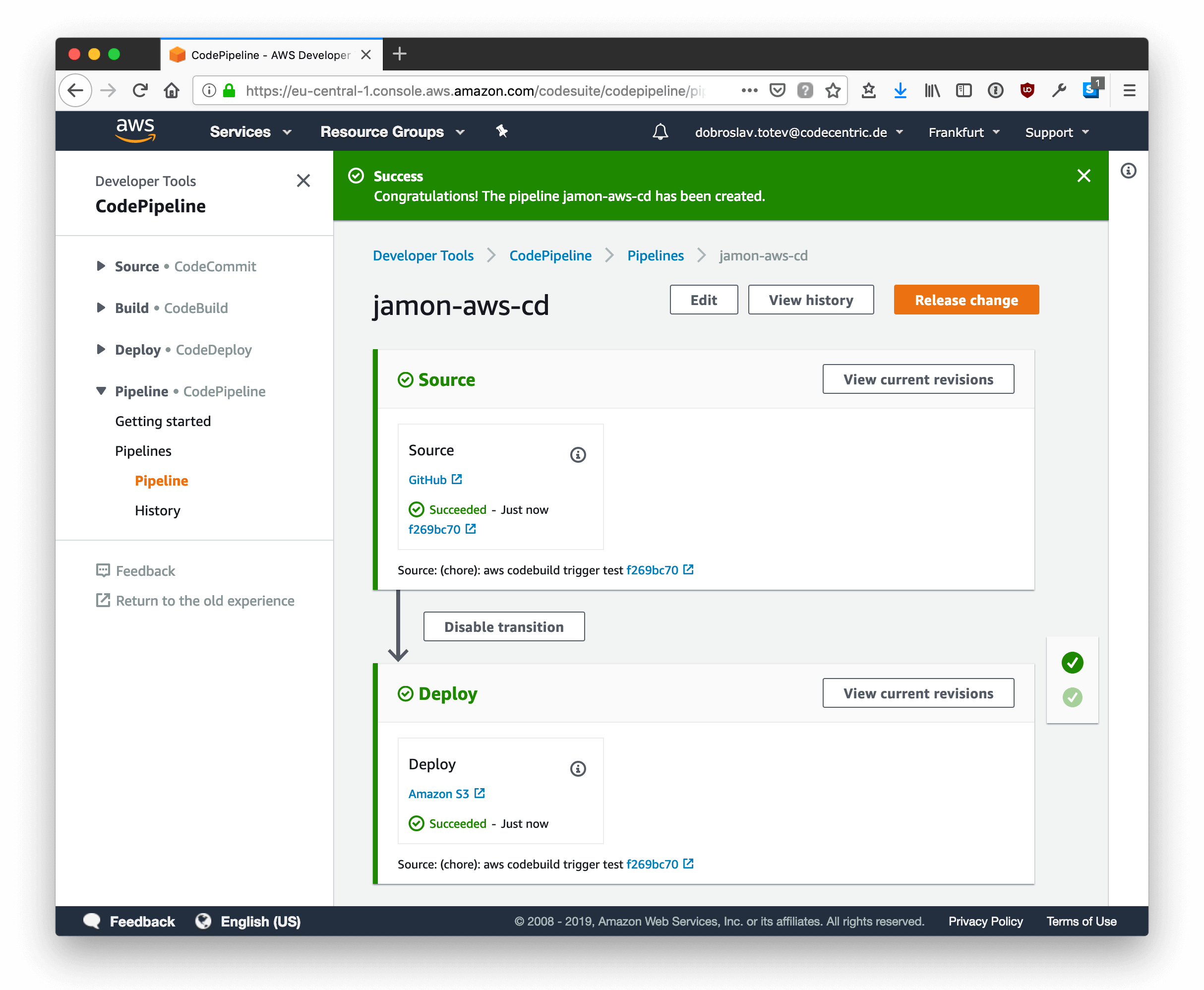 This should do it and our code should get automatically deployed on every repository update. Let’s check if everything is working by triggering a build via a commit in the repository: