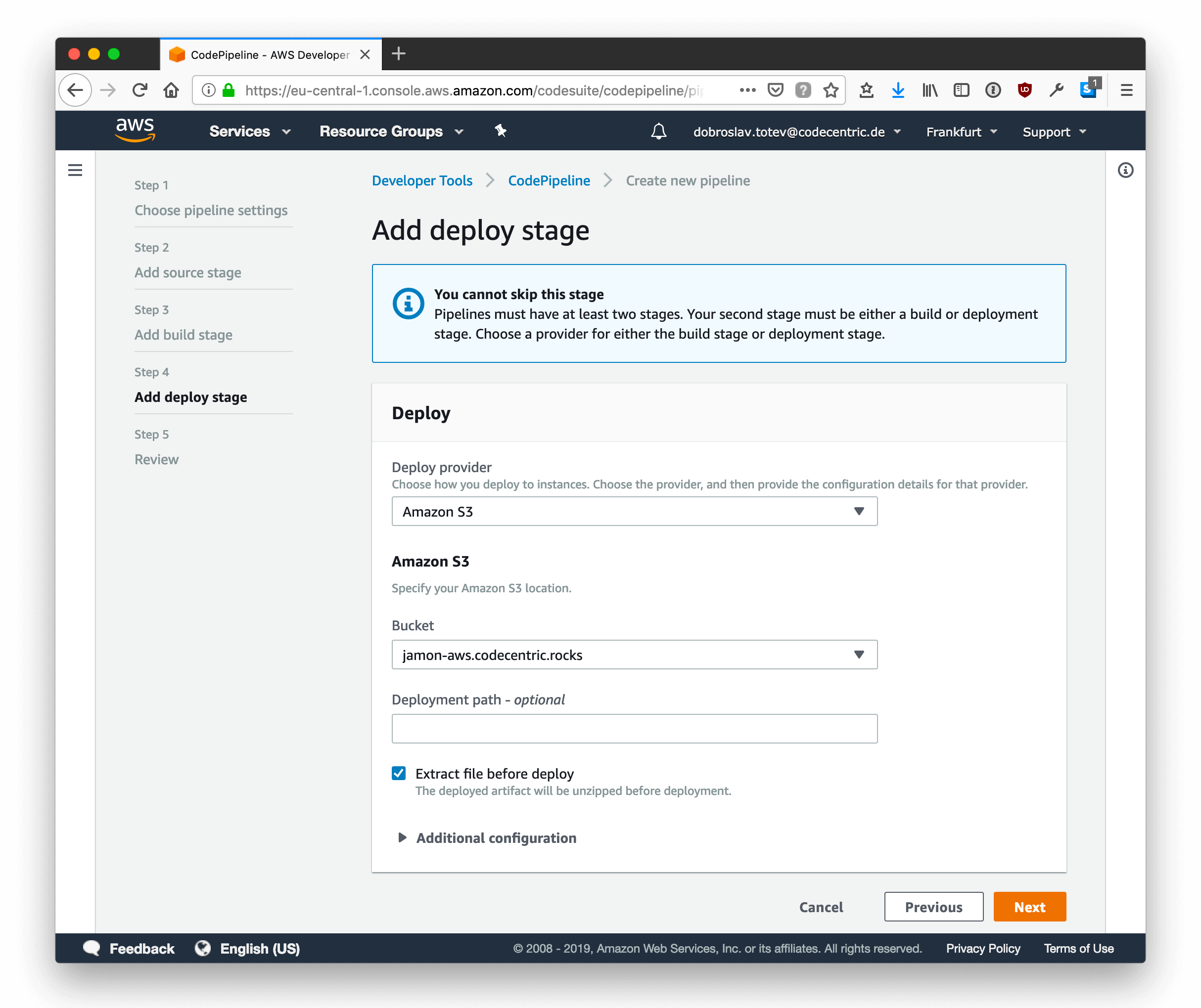 Configure the actual deployment. We want to use our previously created S3 bucket for this. Remember to select the extraction option as code pipeline zips the artifacts by default.